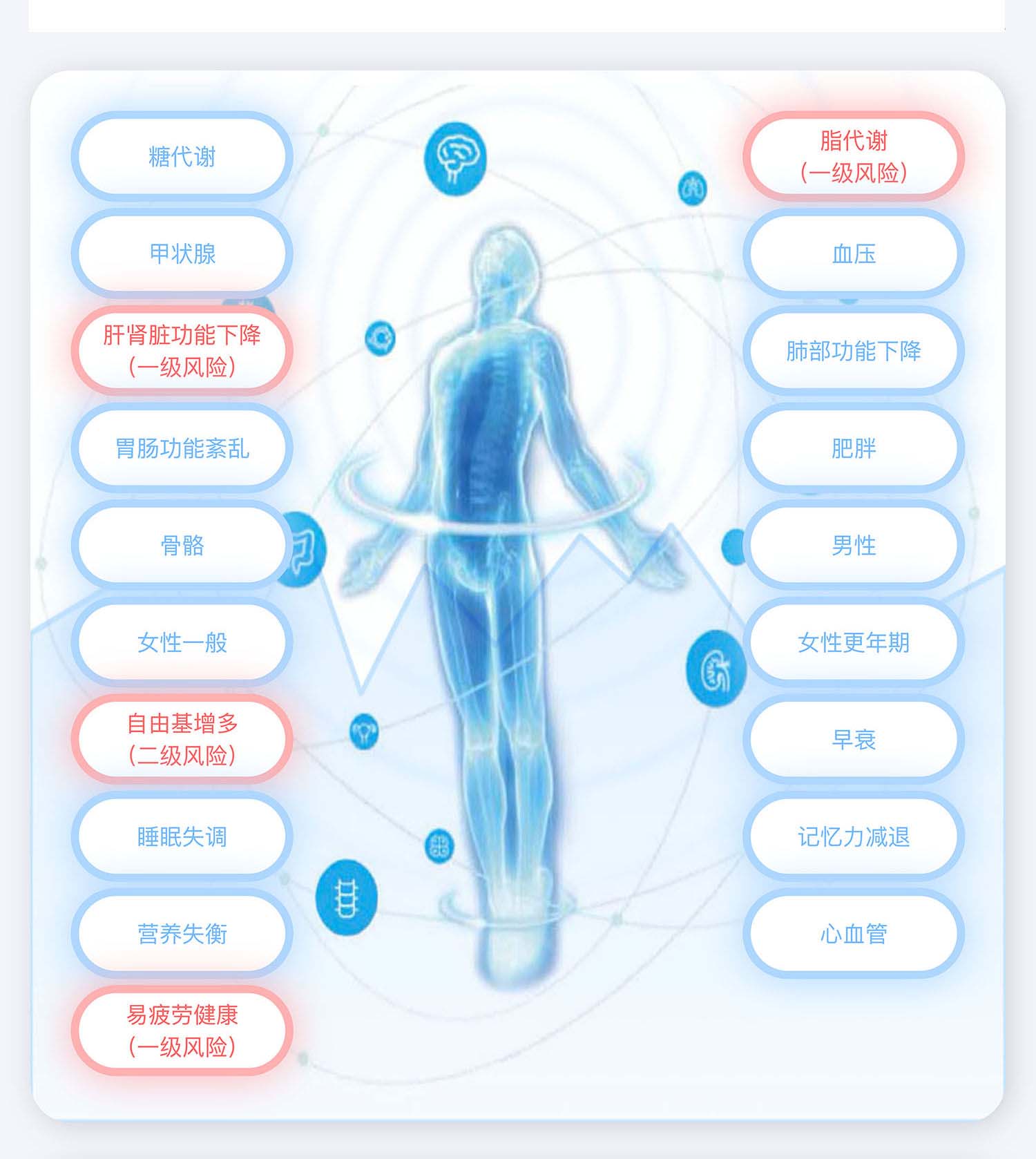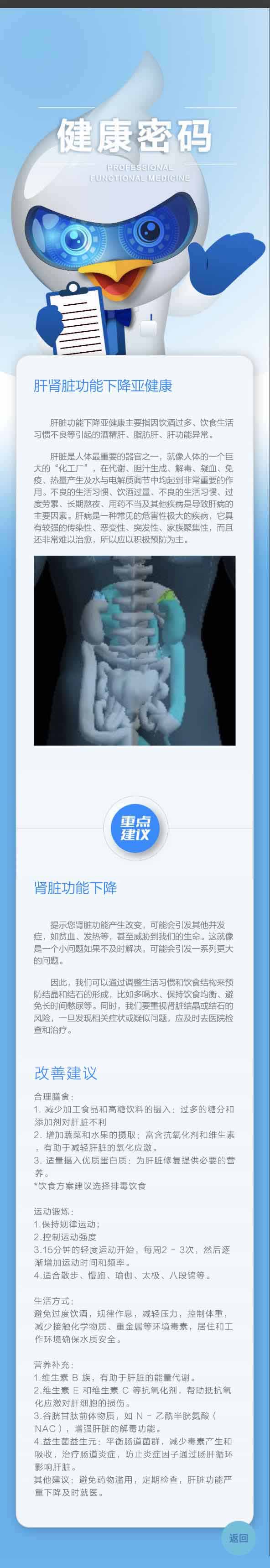 A版:專業(yè)版報(bào)告,開(kāi)放人群:健康管理師,醫(yī)生等專業(yè)人士。專業(yè),系統(tǒng)的評(píng)估身體的各大指標(biāo),并且自帶解讀報(bào)告功能,解決方案,是有效的健康管理的工具。